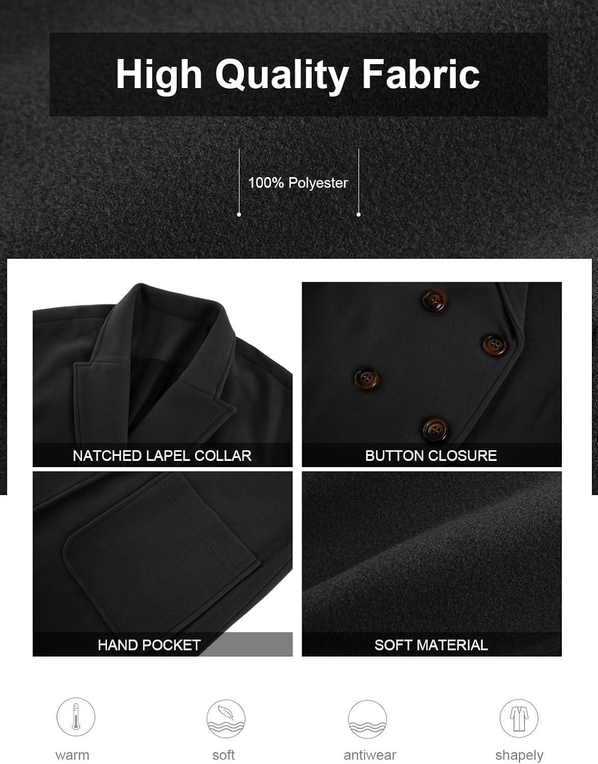This is a must have coat! It dresses so nice for formal work events! The fabric is not wacky and it does not feel cheap! Definitely a great choice and not crazy expensive! I will definitely consider getting a new one in a different color.
