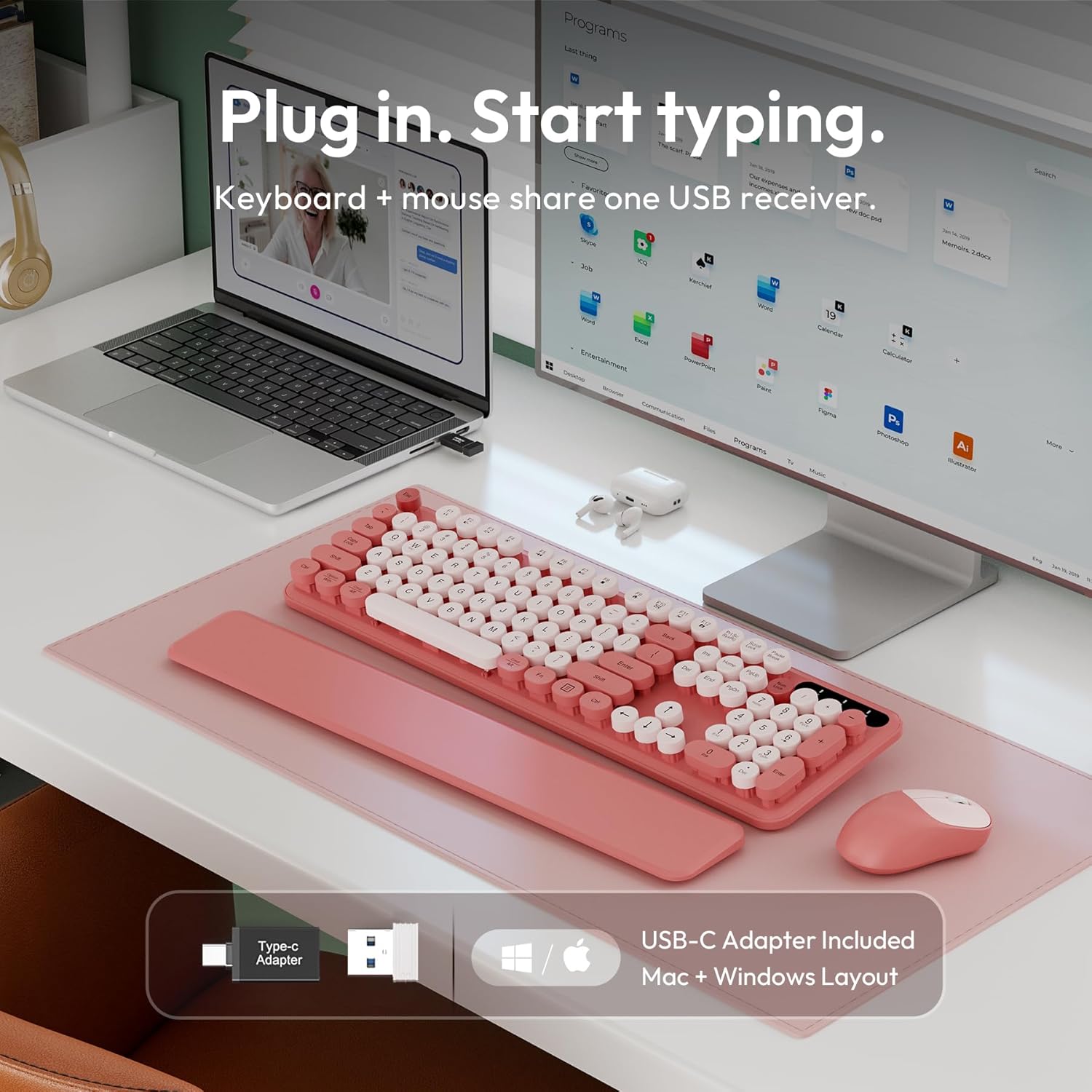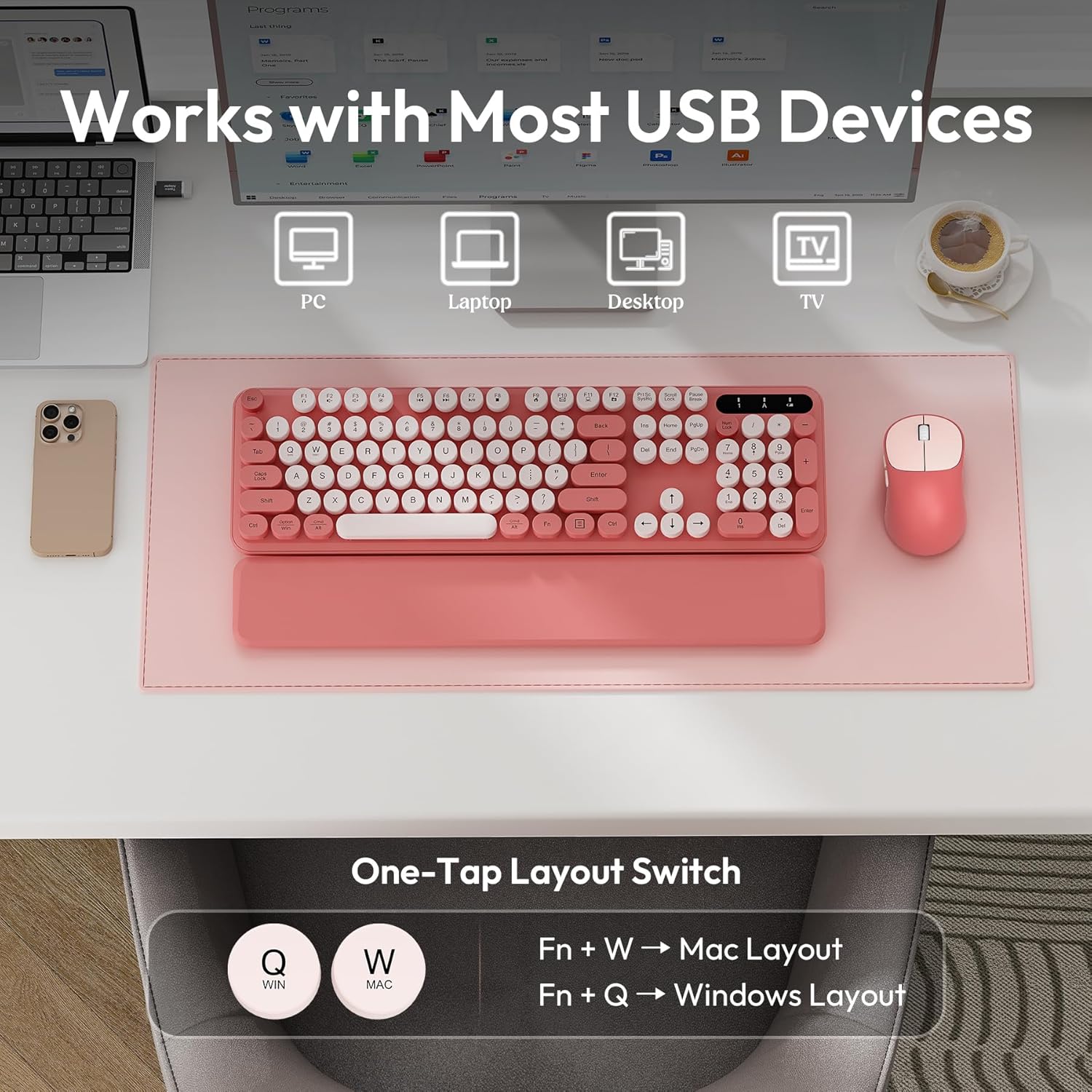 9 reviews for Wireless Keyboard and Mouse Combo, Typewriter Keyboard with Magnetic Wrist Rest, Full-Size Retro Round Keycaps, Smart-Sleep, 2.4GHz Stable Connection for Mac/Windows/PC, Trueque(Blush Pink)