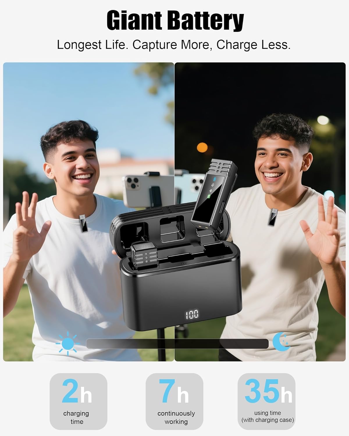🔋 【All-Day Power That Keeps Up With You】Get up to 7 hours of continuous recording from this phone microphone alone, and over 35 hours total with the charging case. The case features a clear digital battery display so you always know your power status, plus support for fast charging. Ideal for all-day meetings, outdoor live streams, or long trips—stay powered wherever inspiration takes you.